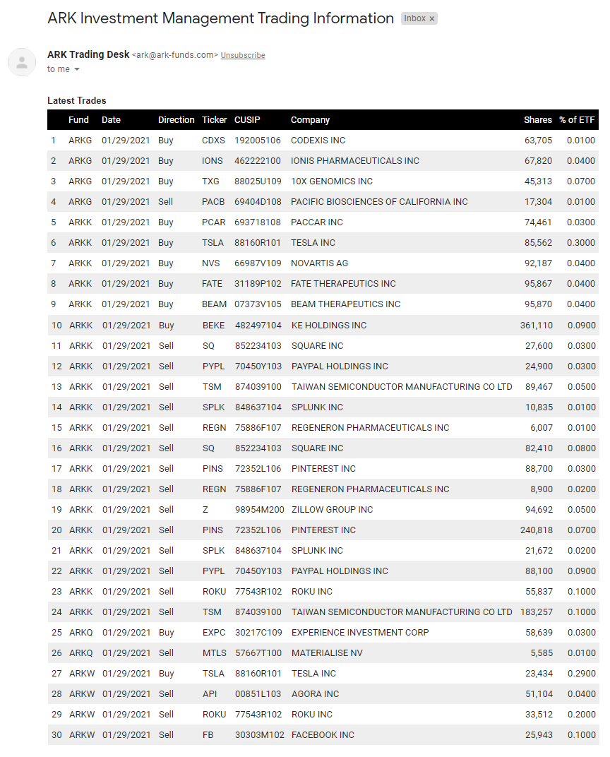 GME 사태로 변동성이 컸던 시장에서 ARK는 굉장히 많은 수의 종목을 매도했다. 미쳐 돌아가는 시장에서 현금 확보는 누구도 반박할 수 없는 지혜로운 선택이리라.