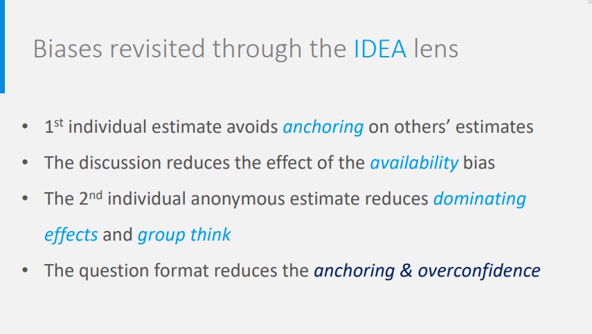 The 2nd individual anonymous estimate reduces dominating effects and group think and the question format reduces the anchoring and overconfidence as already mentioned. You will have the opportunity to see the IDEA at work after this video.