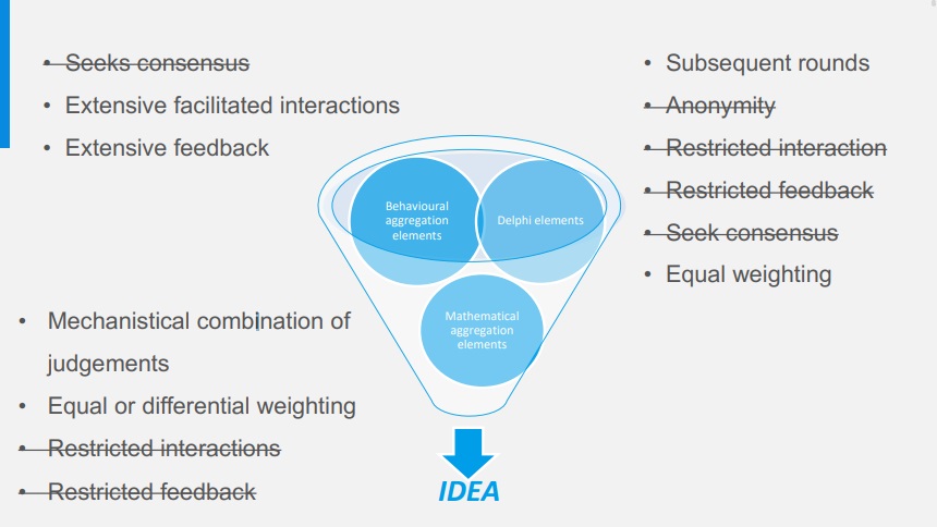 IDEA를 특징짓는 대부분의 요소는 새로운 것이 아닙니다. 그것의 가장 중요한 기여는 이러한 요소들을 결합하는 구조화된 접근법입니다. IDEA는 Investigate, Discuss, Estimate, Aggregate를 말합니다. IDEA 프로토콜에서 전문가들은 후속 라운드(일반적으로 2개)에 대해 개별적인 판단을 합니다. 광범위한 촉진 상호 작용이 라운드 간에 이루어집니다. 진행자는 첫 번째 견적에 대한 피드백을 제공합니다.